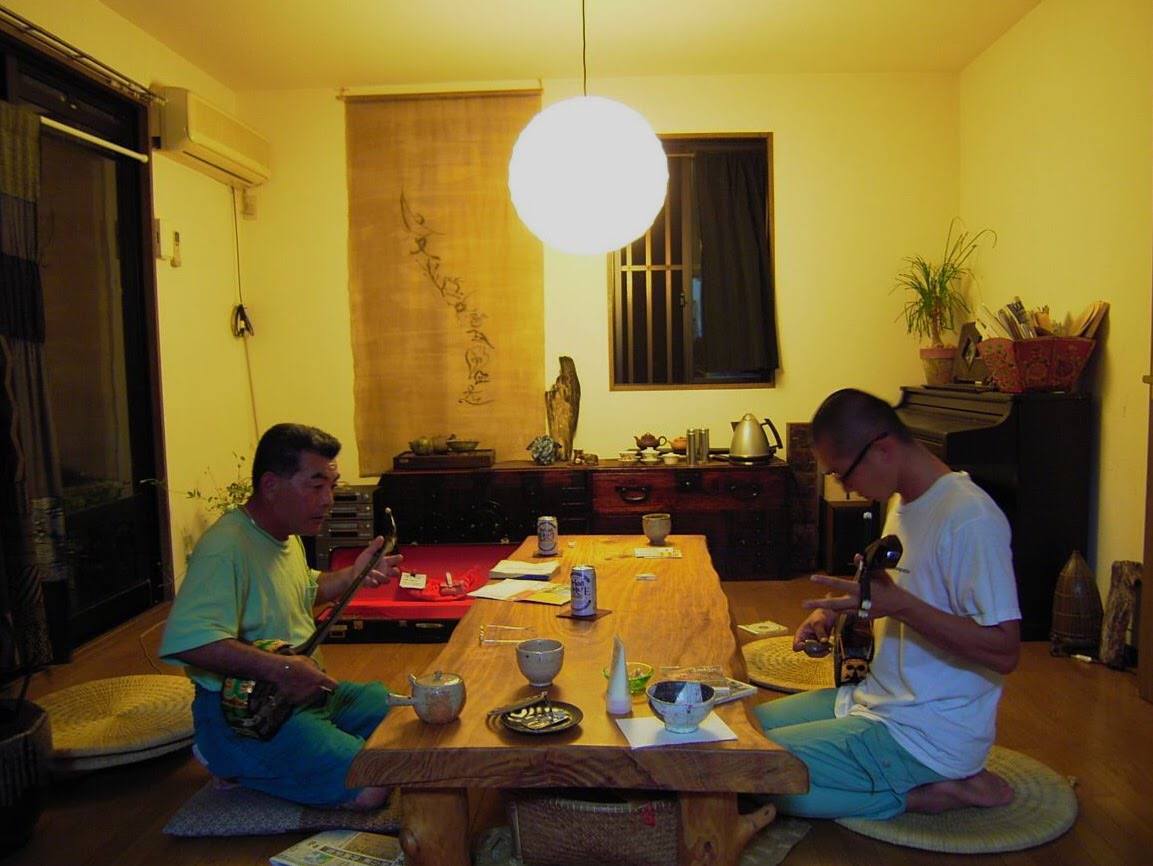 私自身、息子を妊娠していた当時は沖縄に住んでいて、そのころ夫が熱心に沖縄三味線−サンシンを練習していました。毎晩のように近所のサンシンの先輩が、オリオンビール片手にやってきて、座卓のあっちとこっちに向かい合って座り、稽古をつけてもらっていました。夫が入門したのは古典の安冨祖流。新人賞のために練習していた課題曲は、長く音を伸ばすお経のような発声、風情のあるシンプルなサンシンの音色。7分ほどの長い歌。