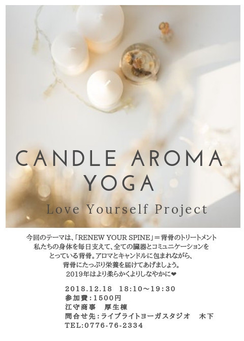 Candle Aroma Yoga Rumi 日時:2018年12月18日18時10分ー19時30分参加費:1500円会場:江守商事 厚生棟問合せ:0776-76-2334、info@livelight.jp