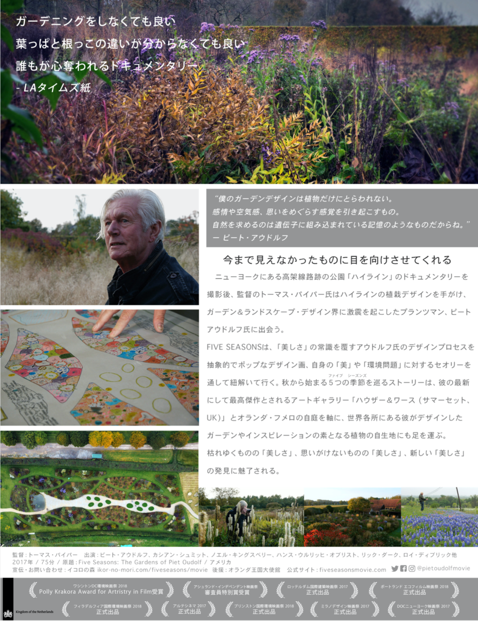 ピート・アウドルフは植栽に雑草を取り入れたり、枯れた植物にも美しさを見出したりと“美しさ”の常識を覆し、また革新的なアイデアによって庭園や公共スペースの可能性を広げてきました。まさにアートとよぶべき彼のガーデンはガーデニング界のみならず、著名なキュレーターであるハンス・ウルリッヒ・オブリストをはじめとする美術界や、都市計画の分野の人々の注目をも集めています。本作は秋・冬・春・夏・そして秋と5つの季節に渡ってアウドルフによりそい、感覚的でありながら明解でポップなデザイン画や、“美”や“環境問題”に対する彼の考察を紹介しながら、その唯一無二の創造過程を明らかにします。(fiveseasonsより引用)