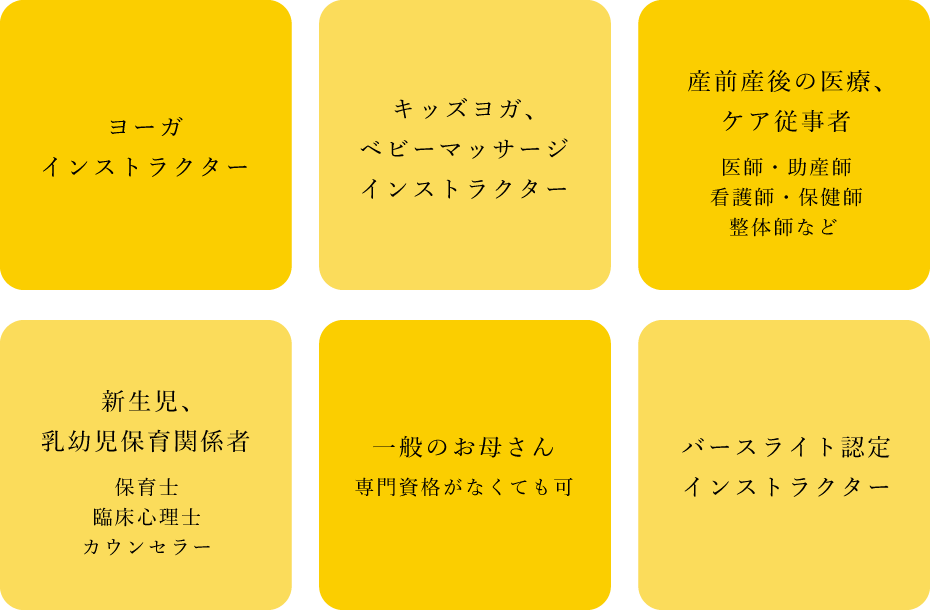これからマタニティヨーガやベビーヨーガを教えてみたいと考えている方、またヨガインストラクターや助産師、保健師が新しいアイディアを得てスキルアップするためにぴったりなコースです。